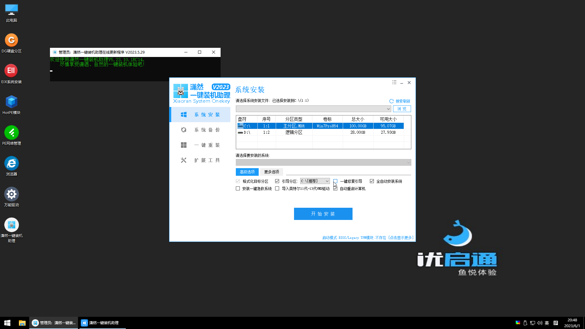 立即重启进入 WinPE(PE下含网络和远程),引导客户打开远程,操作分区后,使用潇然一键装机助理=>一键重装